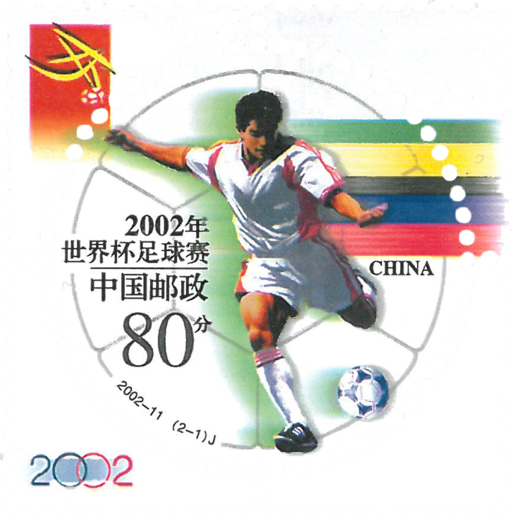 2002年世界杯足球赛于5月31日至6月30日在韩国和日本举行。中国国家足球队第一次进入世界杯足球赛决赛圈。中国队于2001年10月7日,在沈阳五里河体育场,战胜阿曼队,以小组第一的成绩提前两轮出线。经过44年的努力,中国足球终于在第七次冲击中圆了世界杯之梦!国家邮政局5月16日首次发行一套圆形邮票,并以"新的起点"和"团结拼搏"为两枚邮票命名,寓意深刻,既将中国足球运动这一具有历史意义的事件记录在邮票上,更为踏上世界杯征程的国足队员们加油!