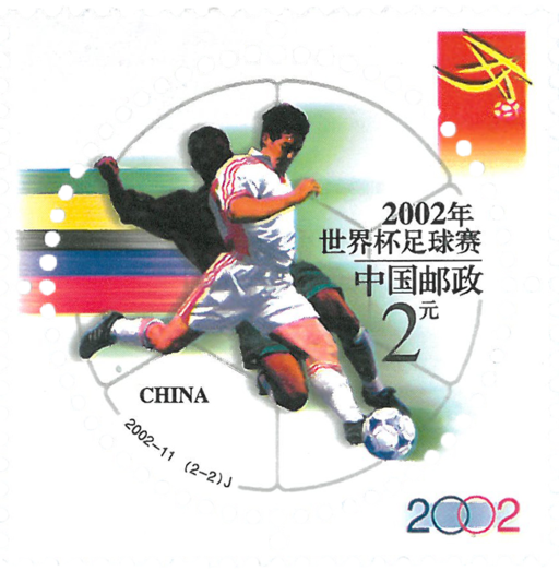 2002年世界杯足球赛于5月31日至6月30日在韩国和日本举行。中国国家足球队第一次进入世界杯足球赛决赛圈。中国队于2001年10月7日,在沈阳五里河体育场,战胜阿曼队,以小组第一的成绩提前两轮出线。经过44年的努力,中国足球终于在第七次冲击中圆了世界杯之梦!国家邮政局5月16日首次发行一套圆形邮票,并以"新的起点"和"团结拼搏"为两枚邮票命名,寓意深刻,既将中国足球运动这一具有历史意义的事件记录在邮票上,更为踏上世界杯征程的国足队员们加油!