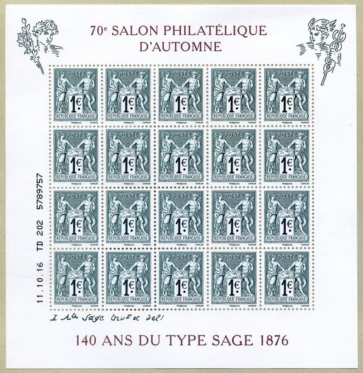名称:法国11月3日发行2016秋季邮展-1876邮票140周年邮票