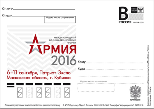 名称:俄罗斯9月5日国际军事技术论坛“2016年陆军”邮资片