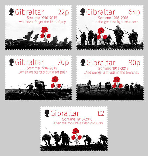 名称:直布罗陀5月16日发行索姆河战役100周年邮票