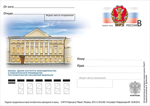 俄罗斯10月14日发行立法与比较法研究所纪念邮资片