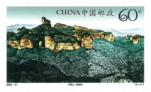 丹霞山位于广东省仁化县境内,是国家重点风景名胜区,国家地质地貌自然保护区。丹霞山因“色如渥丹、灿若明霞”而得名,它有着神奇瑰丽的丹霞地貌(地理学上把由红色砂砾岩经长期风化剥离和流水侵蚀而形成的、以赤壁丹崖为特色的地貌形态称为丹霞地貌)。景区内群峰林立,造型奇特,山坡陡峭,古木葱郁,山麓河谷与丹山碧水相映成辉,锦江秀水 纵贯南北。《丹霞山》邮票主图表现的是僧帽峰、翔龙湖、茶壶峰和锦江的壮观景象。