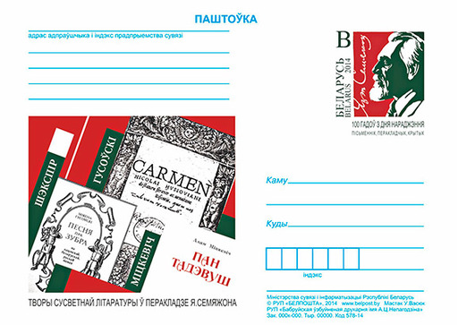 名称:10月30日白俄罗斯发行约瑟夫Semezhona诞辰100周年纪念邮资片