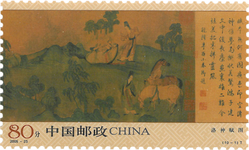 《洛神赋图》根据三国时曹植《洛神赋》-文而作。相传伏羲的女儿宓妃溺水洛河,成为美丽的洛河之神。三国曹植途经洛河,联想洛神传说,感念自己身世,叙写男女情思,遂成文史名篇《洛神赋》。《洛神赋图》相传为东晋顾恺之所作。画卷构思奇特,故事衔接连贯,堪称古代绘画之精品。