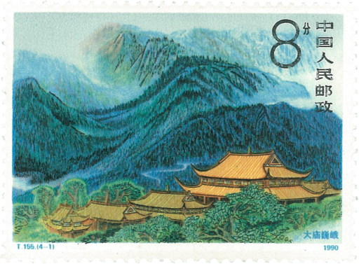 衡山,位于湖南省南部,花岗岩断块山体,山势雄伟,有七十二峰,以祝融、天柱、芙蓉、紫盖、石廪五峰为著名,名胜古迹有南岳庙、望日台、祝融寺等。本套邮票是1988年以来我国发行的“五岳”系列邮票的第三套。