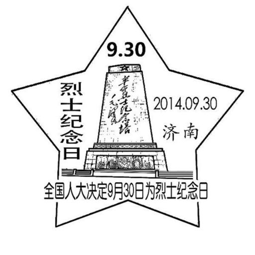 为纪念我国首个烈士纪念日,山东省邮政公司济南市分公司特推出纪念邮戳一枚,图案为五角星,中央矗立着刻有毛泽东同志题词的济南英雄山“革命烈士纪念塔”,并注以“全国人大决定9月30日为革命烈士纪念日”。该纪念邮戳在济南英雄山邮局启用。