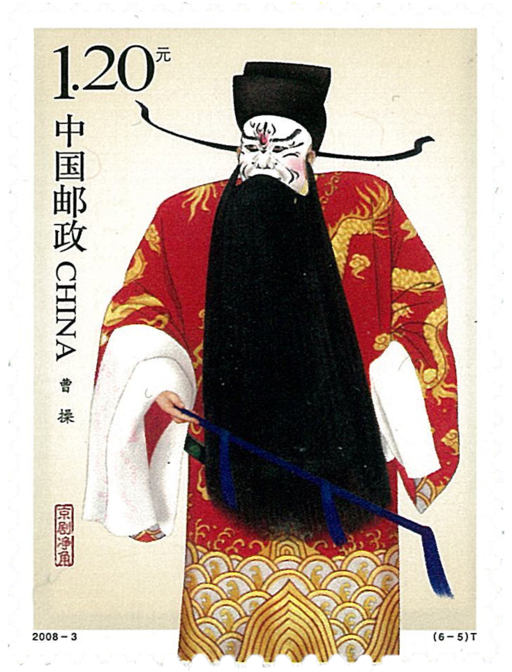 净角俗称花脸,因用多种色彩在脸上画脸谱而得名。净角主要表现性格豪放、粗鲁、刚烈、忠直或者奸诈的男性。他与生角相比,在化妆、唱腔、形体和表演等方面都有很大的不同,首先是在形象上,化妆极为夸张;其次是发声较为浑厚;再次是动作造型刚强有力。净角所扮演的人物就成为不同于常人的大丈夫、大英雄或大强盗,给人一种强烈的震撼。《京剧净角》特种邮票分别由《大保国》中的铜锤花脸徐彦昭、《铡美案》中的黑头花脸廉颇、《芦花荡》中架子花脸张飞、《长坂坡》中架子花脸曹操、《金沙滩》中武花脸杨延嗣组成。