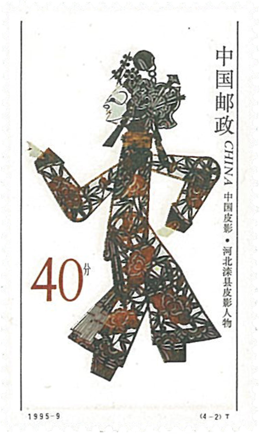 这枚邮票图案上的人物为皮影戏《黑水国》中的西蜀秀才韩幼奇。人物脸谱夸张,斜直线从额头向下,一气呵成通天鼻,眉毛和眼睛向上吊起,使人物形象既显得清秀、聪颖,又潇洒、大方,富有立体感。