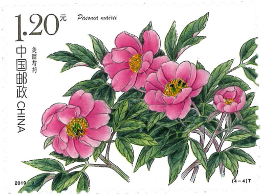 芍药,芍药科芍药属,多年生草本,花大而美丽,是重要的观赏植物与药用植物。被誉为“花仙”、“五月花神”。芍药属植物全世界约有30种,主要分布于欧亚大陆温带地区,少数产北美洲。中国有15种,分布于西南、西北华中、华北和东北。牡丹与芍药同为芍药属同胞姊妹,惜牡丹花期不长;而芍药花艳丽如彼,毫不逊色,且花期一直延续至6月,使人类尽享自然界之美。芍药可做专 类园、切花、花坛用花等,芍药花大色艳,观赏性佳,和牡丹搭配可在视觉效果上延长花期,因此常和牡丹搭配种植。芍药属于十大名花之一。该套邮票采用传统的中国工笔画法,注重花朵、叶片形态的细节描绘,用笔工整细致、敷色自然淡雅,在虚实变化间描绘出梦药典雅、清丽的姿态。邮票印制采用胶雕套印工艺,通过雕刻师娴熟的技法、精彩的刀工、生动的点线,绘就了一幅幅生机盎然的芍药盛开美景。