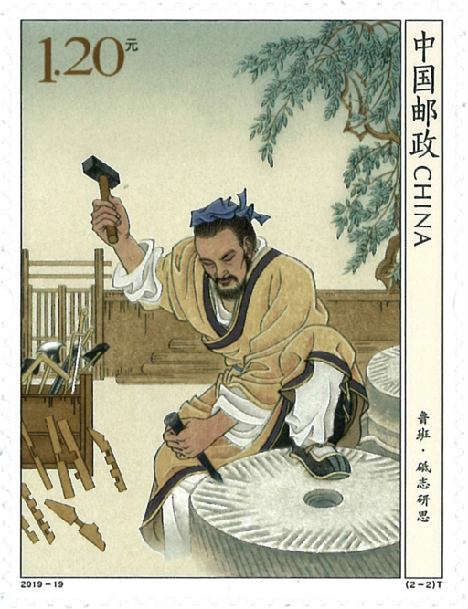 鲁班,中国古代建筑工程家,被建筑工匠尊为祖师,民间称百工师祖。姓公输名般,或称公输班、公输子等,春秋时 期鲁国人,因称鲁班。在中国绝对是一位家喻户晓,妇孺皆知的人物。传说中,不仅创制了“木匠工具箱”而被尊为“木匠祖师爷”;更是为后世木匠解决诸多建筑难题,被誉为“建筑业的行业神”,至今中国建筑业的最高奖一鲁班奖。鲁班的名字和他的发明事迹散见于先秦诸子的论述中。《墨子》载其“为楚造云梯之械”,能“削木以为鹊,成而飞之”。唐以后,有关鲁班的民间传说愈加丰富,体现了对以鲁班为代表的中国古代工匠的歌颂。孜孜学艺描绘了鲁班年轻时访得名师后,在山洞中专心研习的场景;砥志研思描绘了鲁班凿刻大石发明石磨的场景。小 型张为鲁班像,描绘了鲁班手持墨斗,神情坚毅、目光炯炯,这是千万工匠不断钻研、追求极致的真实写照,也是“工匠精神”的生动体现。