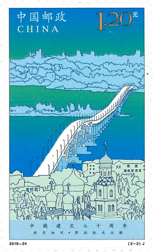 2019年是中华人民共和国与俄罗斯联邦建交70周年。70年对于中俄关系来说既是里程碑,也是新起点。70年来,世界风云变幻,两国也发生了翻天覆地的变化,中俄友好合作关系经受住了严峻考验,不断取得新的、举世瞩目的发展。特别是上世纪九十年代以来,两国关系经历了三个重要发展阶段,从建立“面向21世纪的中俄战略协作伙伴关系”,到“平等信任、相互支持、共同繁荣、世代友好的中俄战略协作伙伴关系”,再到“新时代中俄全面战略协作伙伴关系”,两国关系始终保持高水平运行,一步一个脚印,不断迈上新台阶,成为当今世界绝无仅有的对话而不对抗,结伴而不结盟,不针对任何第三方的新型大国关系典范,也成为世界上互信程度最高、协作水平最高、战略价值最高的一对大国关系。长江和伏尔加河分别是中国和俄罗斯的母亲河,在两国文化、历史中占据非常重要的位 置。两枚邮票分别选取长江、伏尔加河上的大桥,中国方面选取盛夏时节的重庆朝天门长江大桥,俄罗斯方面选取隆冬之际的萨拉托夫大桥。