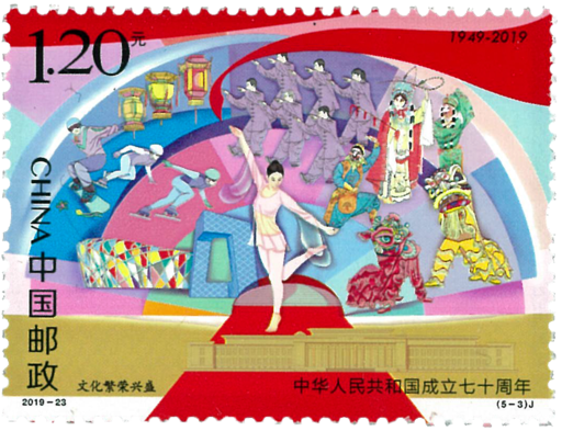 2019年是中华人民共和国成立70周年,首都北京举行隆重热烈的庆祝活动。庆祝活动充分 展示中华人民共和国成立70年来的光辉历程、伟大成就和宝贵经验,突出展示党的十八大以来以习近平同志为核心的党中央团结带领全党、全军、全国各族人民,进行伟大斗争、建设伟大工程、推进伟大事业、实现伟大梦想、推动党和国家事业取得的历史性成就、发生的历史性变革,激励和动员全党、全军、全国各族人民紧密团结在以习近平同志为核心的党中央周围,不忘初心,牢记使命,为决胜全面建成小康社 会夺取新时代中国特色社会主义伟大胜利、实现中华民族伟大复兴的中国梦不懈奋斗。70年砥砺奋进,中国共产党紧紧依靠人民,跨过一道又一道沟坎,取得一个又一个胜利,创造了人类发展史上惊天动地的奇迹,让中华文明在现代化进程中焕发出新的蓬勃生机,让科学社会主义在21世纪焕发出新的蓬勃生机,使中华民族焕发出新的蓬勃生机。在庆祝新中国成立70周年之际,中国邮政发行纪念邮票,展示祖国 在经济、政治、文化、社会、生态文明等方面取得的巨大成就。邮票设计采用壁画的构图特点和连票的设计形式,既庄重大方,又风格清新。