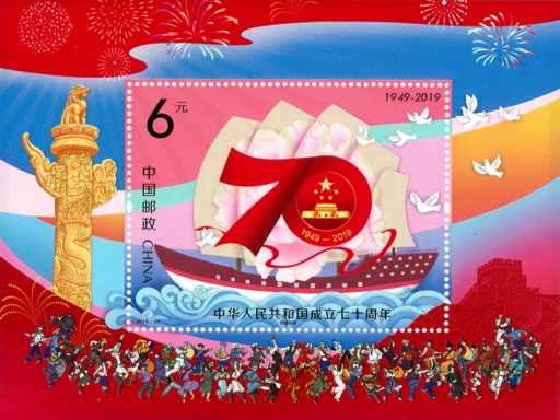 2019年是中华人民共和国成立70周年,首都北京举行隆重热烈的庆祝活动。庆祝活动充分 展示中华人民共和国成立70年来的光辉历程、伟大成就和宝贵经验,突出展示党的十八大以来以习近平同志为核心的党中央团结带领全党、全军、全国各族人民,进行伟大斗争、建设伟大工程、推进伟大事业、实现伟大梦想、推动党和国家事业取得的历史性成就、发生的历史性变革,激励和动员全党、全军、全国各族人民紧密团结在以习近平同志为核心的党中央周围,不忘初心,牢记使命,为决胜全面建成小康社 会夺取新时代中国特色社会主义伟大胜利、实现中华民族伟大复兴的中国梦不懈奋斗。70年砥砺奋进,中国共产党紧紧依靠人民,跨过一道又一道沟坎,取得一个又一个胜利,创造了人类发展史上惊天动地的奇迹,让中华文明在现代化进程中焕发出新的蓬勃生机,让科学社会主义在21世纪焕发出新的蓬勃生机,使中华民族焕发出新的蓬勃生机。在庆祝新中国成立70周年之际,中国邮政发行纪念邮票,展示祖国 在经济、政治、文化、社会、生态文明等方面取得的巨大成就。邮票设计采用壁画的构图特点和连票的设计形式,既庄重大方,又风格清新。