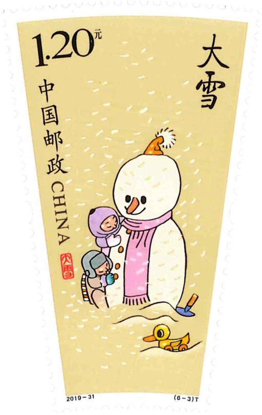 节气既是人们对天文、气象、物候的科学认识总结,也是古代历法的创造之一。节气将一年内太阳运行的位置变化并由此引起的地面气候演变秩序,划分为二十四个阶段,每段约隔半个月时间,然后分配在十二个月里。二十四节气是我国古代劳动人民独创的文化遗产。二十四节气较准确反映了季节的变化并用于指导农事活动,影响着千家万户的衣食住行。二十四节气科学地揭示 了天文气象变化的规律。地球绕太阳运转一周为360度。按照天文学的惯例,以春分点为起点自西向东度量。太阳从黄经零度起,沿黄经每运行15度所到达的时日称为“某一个节气”。二十四节气将天文、农事、物候和民俗实现了完美的结合,衍生了大量与之相关的岁时节令文化,成为中华民族传统文化的重要组成部分。二十四节气反映了太阳的周年视运动,所以节气在现行的公历中日期基本固定,上半年在6日、 21日,下半年在8日、23日,前后不差1-2天。2006年,“农历二十四节气”入选第一批国家级非物质文化遗产名录。2019年11月8日正值立冬,发行《二十四节气(四》特种邮票一套6枚,邮票内容为立冬、小雪、大雪、冬至、小寒和大寒。“立”即开始的意思。立冬公历上一般在每年的11月7日前后。小雪、大雪:开始降雪,小和大表示降雪的程度。小雪在每年公历11月22日,大雪则在12月7日左右。“至”意为极、最。冬至一般在每年公历的12月22日,冬至雪纷纷。小寒、大寒:天气进一步变冷,小寒还未达最冷,大寒为一年中最冷的时候,公历1月5日和该月的20日左右为小、大寒。在2019年发行最后一组时,推出小全张1枚,将四套邮票组合在一起,形成一个圆环。