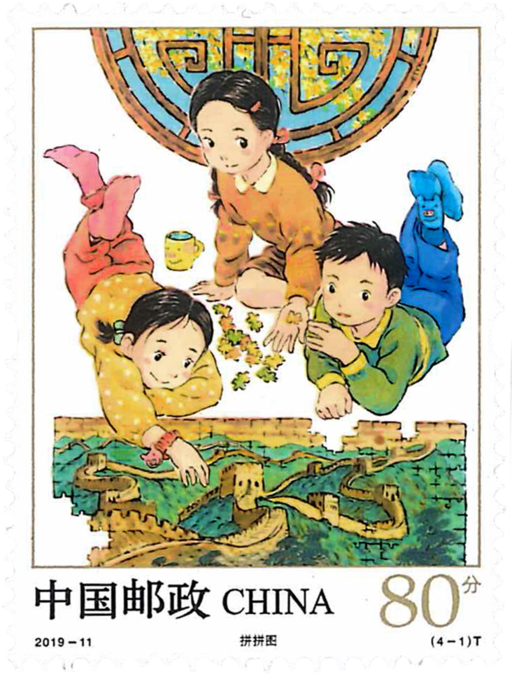 游戏是儿童的天性释放,是童年最美好的回忆。儿童游戏形式多样,本套邮票展现了拼拼图、堆沙堡、滑轮滑、搭积木四种广受现代儿童喜爱的游戏。其中既有益智类游戏,又有活动类游戏。幸福快乐的童年,往往是在与小伙伴的游戏中度过的。无穷无尽的想象空间、诉说不完的童真童趣、随时随地迸发而出的创造力,恰恰蕴藉在游戏当中。