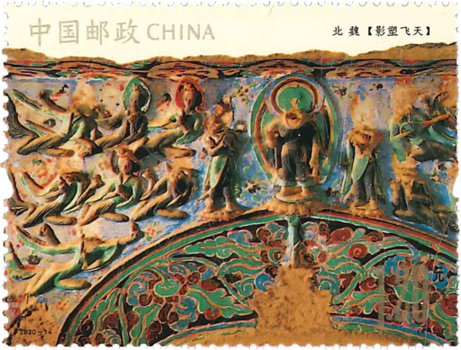 莫高窟,俗称“千佛洞”,位于甘肃省敦煌市东南25千米的鸣沙山东麓,始建于十六国的前秦时期,是以石窟建筑、彩塑和壁画三者合一的佛教文化遗存。经历自4至14世纪的连续开窟造像,这里形成了南北长1600多米的石窟群。莫高窟于1961年成为全国重点文物保护单位,1987年成为世界文化遗产。本套邮票共四枚,内容分别为:北魏时期释迦禅定像、北魏时期影塑飞天、西魏时期佛菩萨像、唐代菩萨坐像。小型张一枚,为唐代释迦佛一铺。