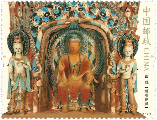 莫高窟,俗称“千佛洞”,位于甘肃省敦煌市东南25千米的鸣沙山东麓,始建于十六国的前秦时期,是以石窟建筑、彩塑和壁画三者合一的佛教文化遗存。经历自4至14世纪的连续开窟造像,这里形成了南北长1600多米的石窟群。莫高窟于1961年成为全国重点文物保护单位,1987年成为世界文化遗产。本套邮票共四枚,内容分别为:北魏时期释迦禅定像、北魏时期影塑飞天、西魏时期佛菩萨像、唐代菩萨坐像。小型张一枚,为唐代释迦佛一铺。