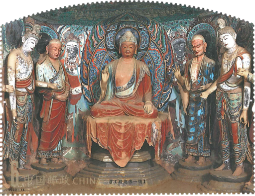 莫高窟,俗称“千佛洞”,位于甘肃省敦煌市东南25千米的鸣沙山东麓,始建于十六国的前秦时期,是以石窟建筑、彩塑和壁画三者合一的佛教文化遗存。经历自4至14世纪的连续开窟造像,这里形成了南北长1600多米的石窟群。莫高窟于1961年成为全国重点文物保护单位,1987年成为世界文化遗产。本套邮票共四枚,内容分别为:北魏时期释迦禅定像、北魏时期影塑飞天、西魏时期佛菩萨像、唐代菩萨坐像。小型张一枚,为唐代释迦佛一铺。