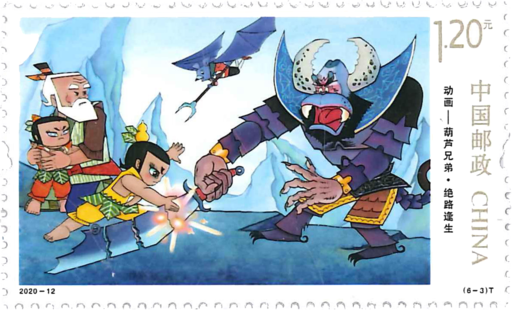 此套邮票共六枚,选取了经典场景进行创作,充分体现了原作的特色和精神,图案名称分别为:七色葫芦、梦窟迷境、绝路逢生、水火奇功、巧夺如意、七子连心。在紫外灯照射下,整套邮票呈现出惊艳的画面效果。邮票两侧葫芦形状的异形齿孔,更增添了趣味性。另外,邮票版式一采用了七色线条构成的葫芦形状作为画面边饰,元素表现极具特色,与邮票主题相映成趣。