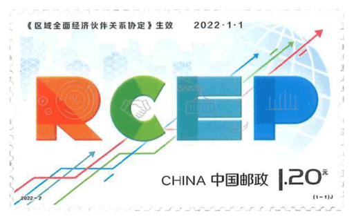 《区域全面经济伙伴关系协定》( RCEP)是一个现代、全面、高质量、互惠的大型区域自贸协定。协定于2022年1月1日对文莱、柬埔寨、老挝、新加坡、泰国、越南等6个东盟成员国和中国、日本、新西兰、澳大利亚等4个非东盟成员国开始生效。邮票画面以协定的英文缩写“RCEP”为主体元素,字母由多彩色块组成,背景采用简约、向上的动感线条,辅以城市楼群、地球等元素,寓意协定的生效将对成员国产生积极影响。