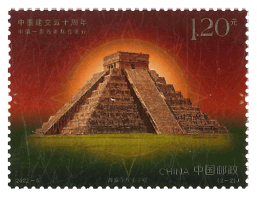 中国与墨西哥都是具有悠久文明历史的国家,两国人民友好交往源远流长。建交半个世纪以来,中墨友谊之树已枝繁叶茂、硕果累累。邮票第一图为“观星台”,其位于河南省登封市告成镇,由元代天文学家郭守敬主持创建,在世界天文史、建筑史上均具有很高的价值。第二图为“库库尔坎金字塔”,其位于墨西哥尤卡坦半岛北部,是墨西哥玛雅古文明的重要遗址之-一。邮票画面以摄影作品为基础,艺术化地展现了中墨两国的历史文化遗产,使中华文明与玛雅文明于方寸间交相辉映。