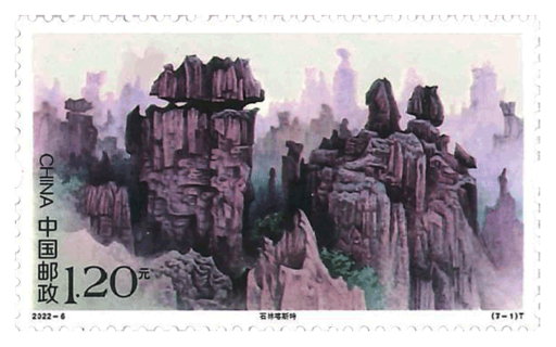 中国是喀斯特地貌分布面积最大的国家,各种喀斯特地貌类型齐全,不仅拥有壮观奇绝的景色,更展现出这一地貌景观的复杂演化历史。石林、荔波、武隆、桂林、施秉、金佛山、环江等7处中国南方喀斯特,于2007年、2014 年分两期人选世界自然遗产。邮票采用西画的绘画方式,在突出中国南方喀斯特地貌景观特征的基础上,进行适当艺术夸张和取舍,使表现内容既符合科学规律又不失艺术美感,整体画面构图饱满、色彩丰富协调、场景雄奇壮阔,展现了中国南方喀斯特独特的自然美。
