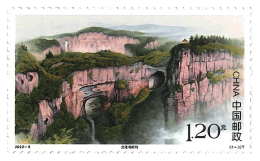中国是喀斯特地貌分布面积最大的国家,各种喀斯特地貌类型齐全,不仅拥有壮观奇绝的景色,更展现出这一地貌景观的复杂演化历史。石林、荔波、武隆、桂林、施秉、金佛山、环江等7处中国南方喀斯特,于2007年、2014 年分两期人选世界自然遗产。邮票采用西画的绘画方式,在突出中国南方喀斯特地貌景观特征的基础上,进行适当艺术夸张和取舍,使表现内容既符合科学规律又不失艺术美感,整体画面构图饱满、色彩丰富协调、场景雄奇壮阔,展现了中国南方喀斯特独特的自然美。