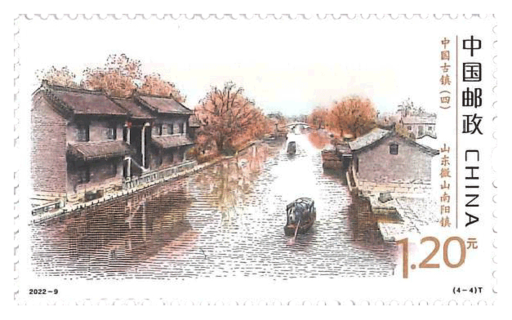 一座座古镇构成了中华文化的不同侧面,荟萃成一部丰富多彩的人文百科全书。本套邮票为《中国古镇》系列第四组,表现了江西浮梁瑶里镇、浙江富阳龙门镇、福建晋江安海镇、山东微山南阳镇各具特色的优美景致。邮票采用雕刻布线配合淡彩的表现形式,整体色彩淡雅秀丽,构图疏密有致,突出古镇古朴诗意的独特韵味,并点缀人物、小船等小品,使画面更加灵动活泼。