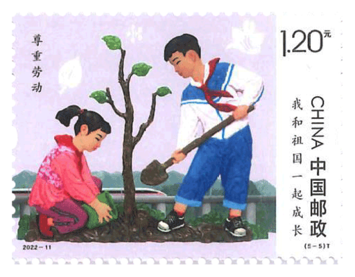 少年强则国强,少年进步则国进步。长期以来,中国宋庆龄基金会关注民族未来,发展少儿事业,2019年以来连续在“六一”国际儿童节期间推出“我和祖国一起成长”主题活动。邮票由中国宋庆龄基金会参与策划,中央美术学院集体创作,表现了我国少年儿童热爱祖国、刻苦学习、崇尚科学、强健体魄、尊重劳动五个场景,且分别采用油画、国画、数字绘画、版画、雕塑五种艺术表现手法,既体现了多元艺术风格,又实现了整体协调统一。