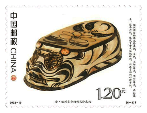 虎在中国传统文化中被视为象征勇气、力量的瑞兽,也是扶正镇邪的保护神。人们将虎的形象融人日常用具、艺术创作之中,用以寄托对美好生活的向往。本套邮票表现了商·伏鸟双尾青铜虎(现藏于江西省博物馆)、春秋·青玉虎形佩(现藏于河南博物院)、汉·白虎瓦当( 现藏于中国国家博物馆)、汉·错金铭文铜虎节(现藏于南越王博物院)、金·磁州窑白釉褐花卧虎枕(现藏于周口市博物馆)、清·皮影飞虎(现藏于中国美术馆)六件虎文物。