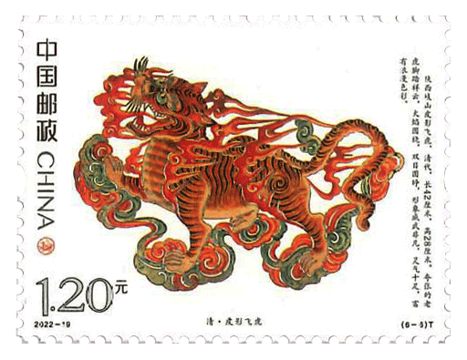 虎在中国传统文化中被视为象征勇气、力量的瑞兽,也是扶正镇邪的保护神。人们将虎的形象融人日常用具、艺术创作之中,用以寄托对美好生活的向往。本套邮票表现了商·伏鸟双尾青铜虎(现藏于江西省博物馆)、春秋·青玉虎形佩(现藏于河南博物院)、汉·白虎瓦当( 现藏于中国国家博物馆)、汉·错金铭文铜虎节(现藏于南越王博物院)、金·磁州窑白釉褐花卧虎枕(现藏于周口市博物馆)、清·皮影飞虎(现藏于中国美术馆)六件虎文物。