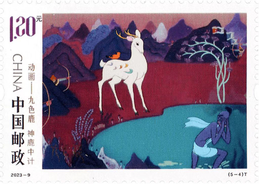 《九色鹿》是中国上海美术电影制片厂出品的动画美术作品,根据莫高窟第257号洞窟壁画《鹿王本生》故事改编,由钱家骏、戴铁郎担任导演,潘絜兹任编剧。本套邮票描绘了神鹿现身、善待万物、救人劫难、神鹿中计、神力化险五个精彩片段,讲述了善良的九色鹿帮助了弄蛇人,弄蛇人却向国王告密出卖九色鹿,最终九色鹿用神力化险,弄蛇人遭到报应的故事。邮票画面采用敦煌壁画的设色风格,同时呈现出动画原片中工笔重彩的特点。