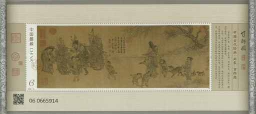 《货郎图》卷,绢本,设色,纵25.5厘米,横70.4厘米,南宋李嵩绘,现藏于故宫博物院。该画展现了走街串巷的货郎手摇蛇皮鼓、俯身笑迎前来的妇人和小儿的场景。邮票画面分别表现了《货郎图》两个精彩局部,着重突出货郎、农妇、孩童、小犬的形象,画面古朴、典雅;小型张采用中国画传统的卷轴形式,完整展现了古画全貌,配合简要的古画介绍,整体构图虚实相映,布局疏密有致。邮票雕刻线条灵动细腻,人物刻画栩栩如生,超高精度的雕刻制版工艺完美还原古画神韵。