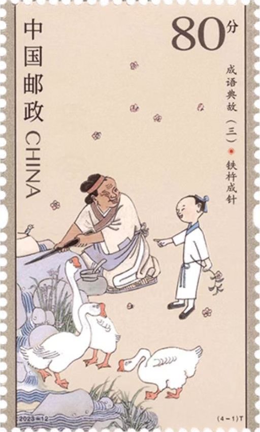 成语是汉语中的璀璨明珠。其结构严谨、凝练含蓄,富有哲理和教育意义,展现了中华民族的悠久历史、高超智慧、传统美德和历久弥新的语言艺术,蕴含着中华民族丰厚的文化底蕴,是弘扬中华优秀传统文化的有力载体。本套邮票采用中国传统工笔绘画手法,分别描绘了铁杵成针、程门立雪、韦编三绝、孺子可教四个成语典故,画面笔墨精湛简约,人物造型古朴传神,兼具传统工笔画的法度和文人画的韵味,表达出成语典故的深刻内涵。