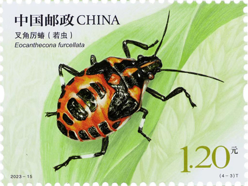 昆虫在生态系统中扮演着重要角色,对人类有着广泛的影响,是生物学研究中的重要对象之一。本套邮票结合自然环境进行设计,采用局部压凸和烫印工艺,生动刻画了乌柏大蚕蛾、棘角蛇纹春蜓、叉角厉蝽(若虫)和阳彩臂金龟四种昆虫的形象。乌柏大蚕蛾是世界上最大的蛾类之一;棘角蛇纹春蜓是一种中等体型的蜻蜓,为国家二级保护动物;叉角厉蝽是一种捕食性蝽,为农林作物害虫的捕食性天敌;阳彩臂金龟以其独特的外观而闻名,为国家二级保护动物。