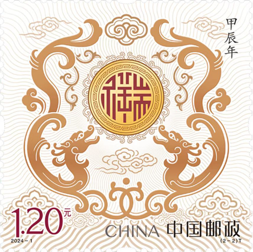 2024年是农历甲辰年,即生肖纪年的龙年。在十二生肖中,龙是神兽,象征尊贵和力量,在民间寓意吉祥好运。《甲辰年》特种邮票一套两枚,画面简洁明快,色彩喜庆吉祥,寓意祥瑞美好。本套邮票第一枚名为“天龙行健”,画面主体为一条昂首奋发的金龙,展现了蓬勃向上、自强不息的精神风貌;第二枚名为“辰龙献瑞”,其图案源于中国传统吉祥纹样“祥龙拱璧”,寓意祥和圆满、福瑞安康。本套邮票以红、金、黑经典三色为主色调,彰显大气、贵气、瑞气和喜气,画面一动一静,相得益彰。