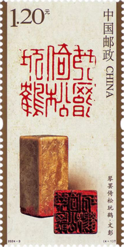 篆刻艺术是中国传统视觉文化艺术形式之一。中国篆刻既可作为艺术作品独立欣赏,又广泛应用于书画创作、金石题跋之中,具有丰富的文化内涵,是中华优秀传统文化的典型符号之一。本套邮票沿用了该系列第一组的竖长票型,采用淡黄底色,全方位展示了印蜕、印章、印面三部分,使用高精度胶版及特种光油印刷,增添了印章和印油的质感。邮票画面主体采用三维立体压凸工艺,根据四枚印章各自的阴刻、阳刻特点选取局部压凸,使得篆刻的细节跃然方寸之上。