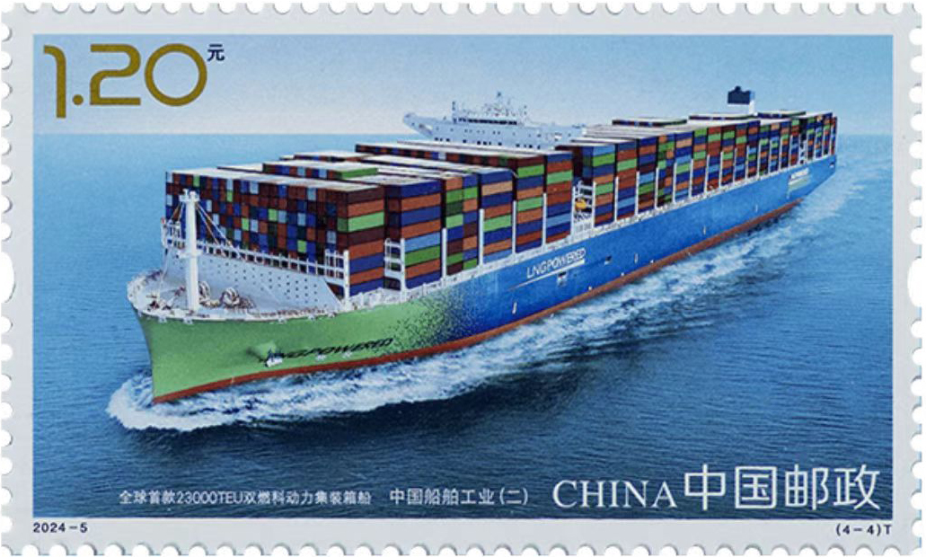 今天,我国已经成为具有世界影响力的造船大国,船舶产业发展取得了辉煌的业绩。本套邮票分别展现了航空母舰——山东舰、055驱逐舰、中国首制大型邮轮、全球首款23000TEU双燃料动力集装箱船的风采,从海洋防御、远洋旅游、海洋运输等方面展示了我国在船舶工业领域取得的成就。邮票图案中,主体船只背景采用风格相异的大海风景,凸显了船只各自的视觉特色。在紫外灯下,无色荧光工艺的运用为大海增添了浮光闪现的效果。