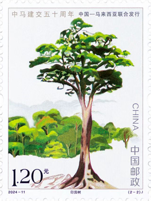中国与马来西亚于1974年5月31日正式建立外交关系。2013年,两国建立全面战略伙伴关系。2023年,两国宣布共建中马命运共同体。本套邮票采用油画方式表现,通过疏密有致的布局、浓淡相宜的色彩和虚实变化的光影,展现出松树和印茄树苍翠挺拔、向天矗立的特点,画面充满蓬勃的生命力。邮票以高精度多色胶印工艺印制,确保了邮票图案的精确度和色彩鲜艳度。背景底色采用专色油墨,票名文字和边框使用金色油墨,通过色彩调节,增加了画面的层次感和纵深感。