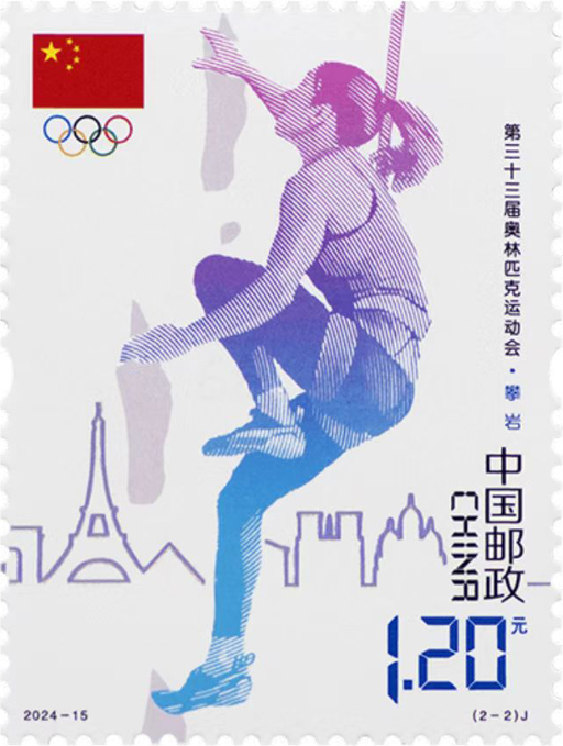 第三十三届奥林匹克运动会于2024年7月26日至8月11日(当地时间)在法国巴黎举行。在本届奥运会上,我国体育健儿勇夺40枚金牌、27枚银牌、24枚铜牌,为祖国和人民赢得了荣誉。邮票第一枚描绘的是男子自由泳,采用从水中仰视的角度,展现运动员劈波斩浪、奋力向前的姿态;第二枚描绘的是女子速度攀岩,采用斜侧视角,展现运动员抬腿踩点、向上攀拉的动作。邮票画面背景以简约的线条勾勒出巴黎城市建筑,整体画面色彩明亮、富有动感。