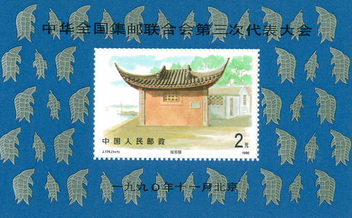 为纪念中华全国集邮联合会第三次代表大会的召开,特发行《中华全国集邮联合会第三次代表大会》纪念邮票小型张一枚。邮票图案以中国古代驿站一“姑苏驿”为主图,四周用宝石兰色衬底,饰以中国古代“鱼”形铭文,使整个小型张色调统一,韵律和谐。