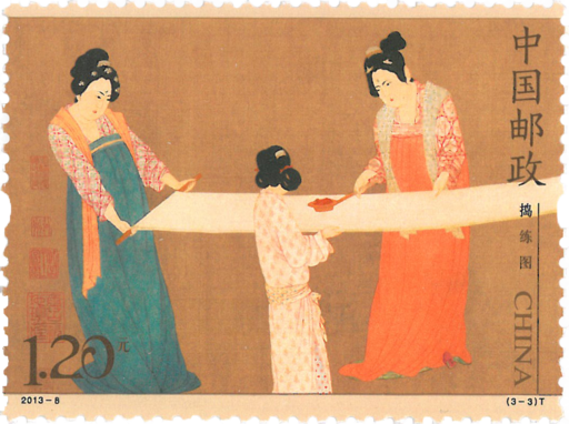 唐代宫廷画家张萱《捣练图》(宋人摹本),工笔重彩,是古代仕女画中的重要遗存,现收藏于美国波士顿美术博物馆。此图表现了唐代妇女捣练缝衣的情景。捣练是一项重要的工序,一些丝帛织成后质地较硬,必须经过水泡捶捣,加工后才能使用。《捣练图》中所绘的人物是宫廷贵妇的形象,应为亲蚕典礼中的部分情景,反映着唐代宫廷生活的一个侧面。
