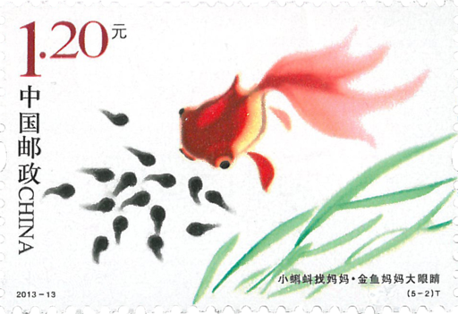 《小蝌蚪找妈妈》,童话故事,原作者方惠珍、盛璐德,通过小蝌蚪寻找青蛙妈妈的过程寓教于乐地讲述了蝌蚪变态发育的科学规律。邮票表现了小蝌蚪向虾公公打听,错认了金鱼、螃蟹、乌龟为妈妈,最后终于找到青蛙妈妈这五个画面。