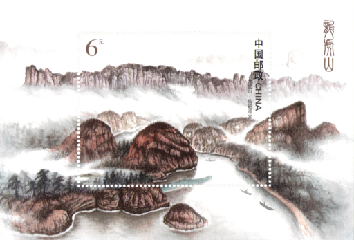 三枚邮票以传统绘画手法描绘,组成一幅完整画面.展现了仙水岩、象鼻山、正一观等著名景点,营造出道家“静净”的氛围,体现了人文与山水的和谐统一。小型张以横式构图,展现云山连绵八百里的广阔与博大,画面远景表现的排衙峰在云中若隐若现,仿佛仙班列队于云端,喜迎天下来客。