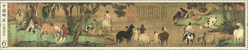 《浴马图》卷,元代书画家赵孟䫍作,绢本,设色,纵28.5厘米,横154厘米。现藏故宫博物院。图绘夏日疏林间,9位奚官(官名,职司养马)为14匹骏马洗浴纳凉的情爱。马的姿态各舁,或饮流啮草,或解鞍倚树,或昂首踞地奚官亦各具情态,有的冲洗马身,有的骑马登岸,有的牵马临溪。溪汞清澈、树木繁茂,画面展现出优雅娴静的风貌,一派乐天自在的逍遥景象。