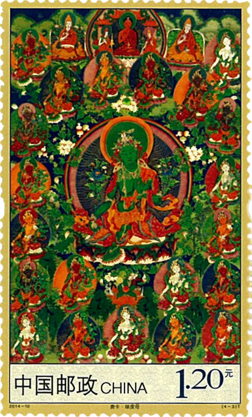 传说唐卡起源于吐蕃时期(7世纪初至9世纪中叶),正式形成于11世纪后半叶并有作品传世,原本是藏传佛教宗教仪式使用的一种宗教绘画,适合藏传佛教僧人游方弘法与观想修习的需要,功能如同一个便于携带的流动神龛。随着内容与形制的演化,唐卡逐渐成为一种独特的艺术样式。本套由票和小型张图案选取的唐卡,均为18世纪作品,清宫旧藏,现存故宫博物院。此五幅唐卡融合藏汉绘画技法,佛、菩萨造像形体优雅,线条流畅,色彩明丽、喜庆,具有浓郁的装饰意味,反映了18世纪前后唐卡的主流审美趋向。邮票所选唐卡中的释迦牟尼佛是佛教创始人,象征汉藏佛教的共同理念;无量寿佛又称阿弥陀佛,寓意长生永在的美好国土;白度母和绿度母的与愿手印象征着祝福,能够帮助众生实现心中的向往;千手千眼观世音菩萨突出展示藏汉佛教慈悲救人、智慧济世的无上情怀。备幅唐卡背面均带有多民族文字题记,表示我国是多民族大家庭,象征着吉祥圆满、万事如意。象征着吉祥圆满、万事如意。