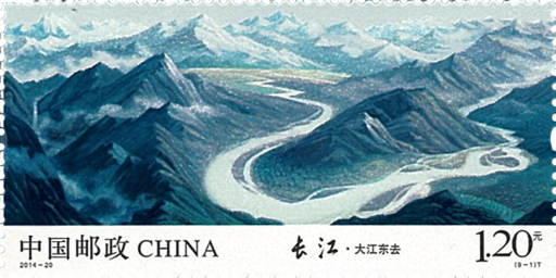 《长江》邮票以袁运甫先生国画长卷《长江万里图》为蓝本,以九图连票形式相衔展现长江万里奔腾的雄姿和气概。青藏高原各拉丹东雪山深处,雪水滴出了第一缕波涛。云南丽江石鼓镇近旁,江流逆转,惊天动地,亮出“长江第一湾”的雄浑。大江同环,毕竟东去。长江和嘉陵江相拥环抱山城重庆——这座在抗战中浴火重生,重为战略要地的中国西部唯一直辖市。进瞿塘峡口,迈出三峡第一步,巫峡十二峰接踵而来,一展神女峰仙姿。两陵峡险滩密布、悬崖飞瀑。