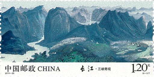 《长江》邮票以袁运甫先生国画长卷《长江万里图》为蓝本,以九图连票形式相衔展现长江万里奔腾的雄姿和气概。青藏高原各拉丹东雪山深处,雪水滴出了第一缕波涛。云南丽江石鼓镇近旁,江流逆转,惊天动地,亮出“长江第一湾”的雄浑。大江同环,毕竟东去。长江和嘉陵江相拥环抱山城重庆——这座在抗战中浴火重生,重为战略要地的中国西部唯一直辖市。进瞿塘峡口,迈出三峡第一步,巫峡十二峰接踵而来,一展神女峰仙姿。两陵峡险滩密布、悬崖飞瀑。