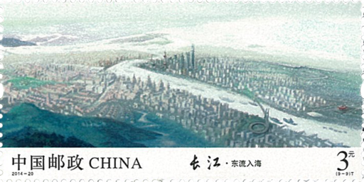 《长江》邮票以袁运甫先生国画长卷《长江万里图》为蓝本,以九图连票形式相衔展现长江万里奔腾的雄姿和气概。青藏高原各拉丹东雪山深处,雪水滴出了第一缕波涛。云南丽江石鼓镇近旁,江流逆转,惊天动地,亮出“长江第一湾”的雄浑。大江同环,毕竟东去。长江和嘉陵江相拥环抱山城重庆——这座在抗战中浴火重生,重为战略要地的中国西部唯一直辖市。进瞿塘峡口,迈出三峡第一步,巫峡十二峰接踵而来,一展神女峰仙姿。两陵峡险滩密布、悬崖飞瀑。